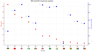 Countries like Ukraine (UA) and Russia (RU) show high WCI scores (indicating high cybercrime prevalence) but relatively low GCI scores (suggesting limited cybersecurity preparedness). This indicates a potential vulnerability due to insufficient cybersecurity measures.Well-prepared nations can still face cybercrime: