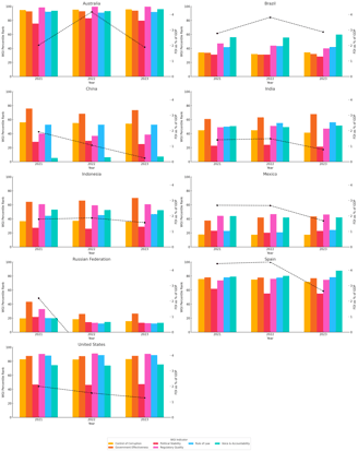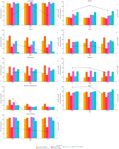 Using six World Governance Indicators (WGI)—like Control of Corruption, Regulatory Quality, and Voice & Accountability—we plotted changes over 2021 to 2023 and compared them with Foreign Direct Investment (FDI) as a percentage of GDP. Each country shows WGI indicators grouped by year, with a clear line tracing its FDI trend.