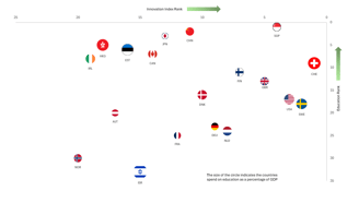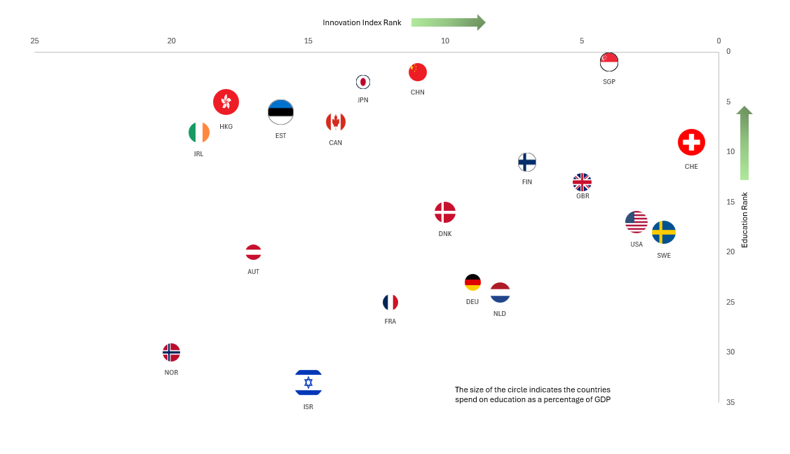 Ireland and Hong Kong have strong education ranks and respectable innovation rankings, yet their smaller circles suggest they achieve this with moderate investment.